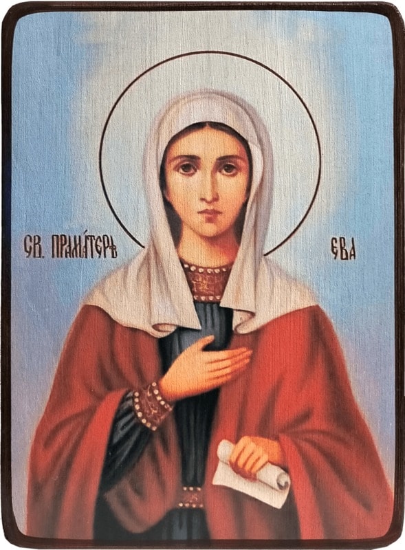 Святая праматерь Ева - это имя известно каждому. Она положила начало роду человеческому и, одновременно, её непослушание научило нас страдать. Адам и Ева - первые люди, созданные бессмертными, нарушив волю Господа, познали духовную смерть и вместе с ней смерть телесную. Согрешившие перед Богом передали болезнь греха всему человечеству, родившемуся от них. Искреннее раскаяние, омытое слезами, сделало праматерь Еву святой. Непослушание Евы было уравновешено послушанием святой девы Марии - Богородицы. Спаситель - Сын Божий, родившийся от человека, своей крестной смертью и последующим воскресением искупил грех Евы, даровав человечеству надежду на спасение - вечную жизнь.