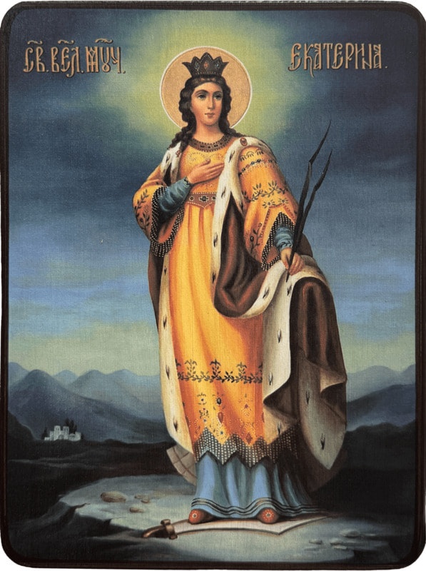 Великомученица Екатерина (до крещения Доротея) Александрийская родилась в 287 году в Александрии. В христианство она была обращена сирийским монахом. Он покрестил её под именем Екатерина. Согласно преданиям после крещения во сне к ней явился Иисус Христос и вручил ей кольцо, назвав своей невестой. В 305 году во время праздничного жертвоприношения, совершаемого императором Максимином, Екатерина вошла в языческий храм и стала призывать императора оставить языческих богов и обратиться в христианство. Максимин был поражён её красотой и пригласил после праздника к себе и попытался её убедить оставить христианскую веру. Но Екатерина осталась непреклонна и отказалась отречься от Христа. За это её подвергли жестоким истязаниям, а затем обезглавили. По преданию, из раны вместо крови вытекло молоко.