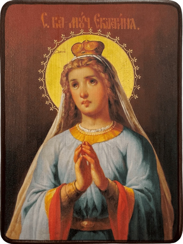 Великомученица Екатерина (до крещения Доротея) Александрийская родилась в 287 году в Александрии. В христианство она была обращена сирийским монахом. Он покрестил её под именем Екатерина. Согласно преданиям после крещения во сне к ней явился Иисус Христос и вручил ей кольцо, назвав своей невестой. В 305 году во время праздничного жертвоприношения, совершаемого императором Максимином, Екатерина вошла в языческий храм и стала призывать императора оставить языческих богов и обратиться в христианство. Максимин был поражён её красотой и пригласил после праздника к себе и попытался её убедить оставить христианскую веру. Но Екатерина осталась непреклонна и отказалась отречься от Христа. За это её подвергли жестоким истязаниям, а затем обезглавили. По преданию, из раны вместо крови вытекло молоко.