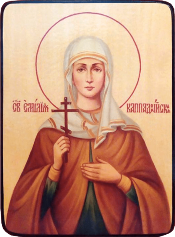 Преподобная Емилия Кесарийская (Каппадокийская) жила ок 310-383 гг. Была матерью десятерых детей, пять из которых Православной Церковью были причислены к лику святых: святителя Василия Великого епископа Кесарии Каппадокийской и Григория епископа Нисского, Петра епископа Севастийского, преподобная Макрина Младшая, принявшая монашеский постриг и поселившаяся в обители, которую она построила в Понте, на берегу реки Ирида, близ горы Ивора, явившую собой образец женского монашества и блаженную Феосевию (так же это имя еще произносится как Феозва), которая стала диаконисой и помощницей святителя Григория.
