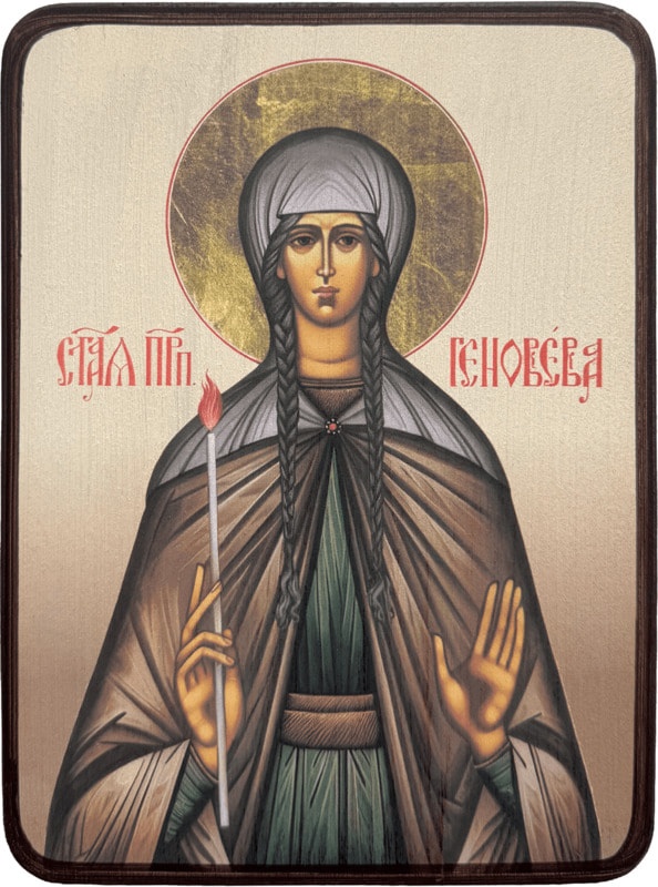 Святая покровительница Парижа преподобная Геновефа (во французском произношении - Женевьева) жила в конце V - начале VI веках. Она родилась недалеко от Парижа в христианской семье. С детских лет возгорелось ее сердце горячим желанием посвятить себя Богу. В те времена в Галии сущствовали уже монастыри, но были также девы, посвятившие себя Богу и остававшиеся жить в миру. После определенного искуса девушка приносила обет безбрачия, а епископ свершал над нею посвящение и давал ей небольшую фиолетовую или красную головную повязку, которая являлась отличительным признаком посвященных Богу дев. Святая Геновефа сподобилась такого посвящения, когда ей было всего 14 лет.