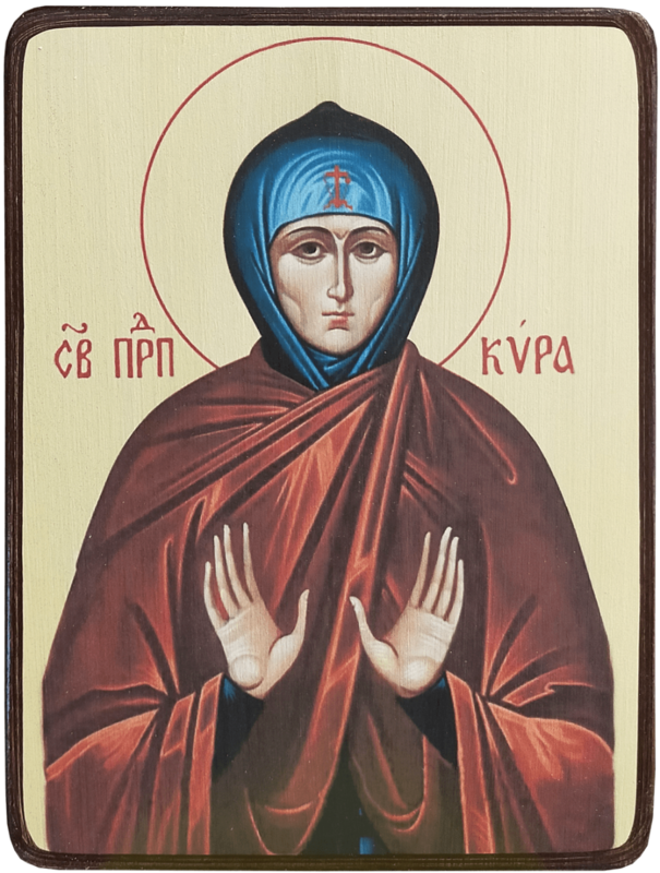 Преподобная Кира - христианская святая, жившая вместе со своей старшей сестрой Мариной в IV веке в городе Берия в Малой Азии. Сестры родились в очень богатой и знатной сирийской семье. Но девочки, видя царящие вокруг них бедность и несчастья других людей, отказались от мирских благ и замужества и, сбежав из родительского дома, решили целиком посвятить себя служению Богу. Достигнув совершеннолетия, они оставили родной дом и удалились из города. Отгородив небольшой уголок земли, Кира и Марина завалили вход в свое убежище глиной и камнями, оставив лишь небольшое отверстие, через которое им подавали пищу, и жили там под открытым небом. Так они прожили 40 лет и скончались около 450 года.