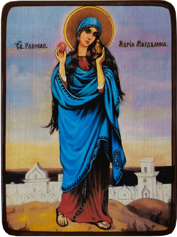 Икона Мария Магдалина на голубом фоне