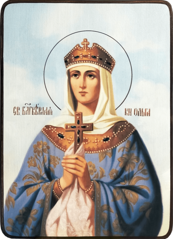 Великая княгиня Ольга родилась в 884 году и была супругой Киевского князя Игоря. В 945 году, после смерти мужа, она фактически становится правительницей княжества при своём малолетнем сыне Святославе. Около 957 года она отправилась в Константинополь, где приняла святое крещение с именем Елена. В Киев она вернулась с иконами, богослужебными книгами. Так началось её апостольское служение. Она воздвигла храм во имя святителя Николая над могилой Аскольда - первого Киевского князя-христианина и многих киевлян обратила ко Христу. С проповедью веры отправилась княгиня на север. В Киевских и Псковских землях, в отдаленных весях, на перекрестках дорог воздвигала кресты, уничтожая языческие идолы. Скончалась великая княгиня Ольга в 965 году.
