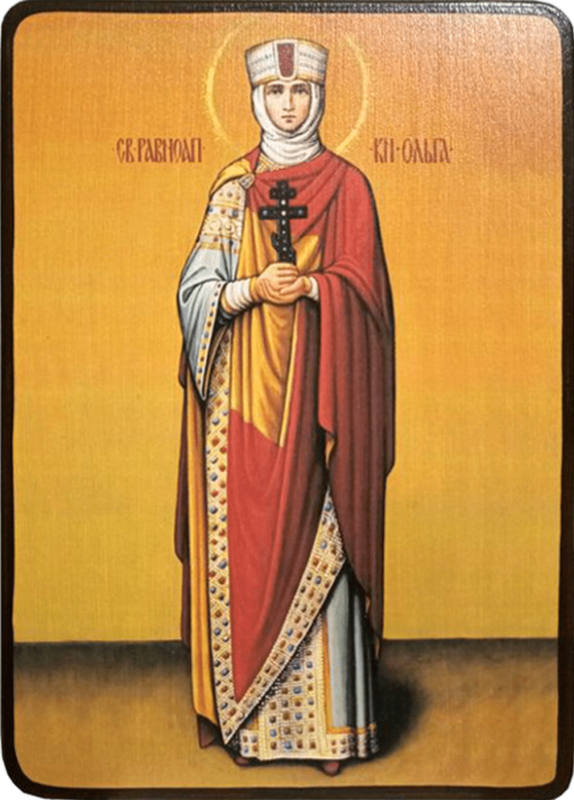 Великая княгиня Ольга родилась в 884 году и была супругой Киевского князя Игоря. В 945 году, после смерти мужа, она фактически становится правительницей княжества при своём малолетнем сыне Святославе. Около 957 года она отправилась в Константинополь, где приняла святое крещение с именем Елена. В Киев она вернулась с иконами, богослужебными книгами. Так началось её апостольское служение. Она воздвигла храм во имя святителя Николая над могилой Аскольда - первого Киевского князя-христианина и многих киевлян обратила ко Христу. С проповедью веры отправилась княгиня на север. В Киевских и Псковских землях, в отдаленных весях, на перекрестках дорог воздвигала кресты, уничтожая языческие идолы. Скончалась великая княгиня Ольга в 965 году.