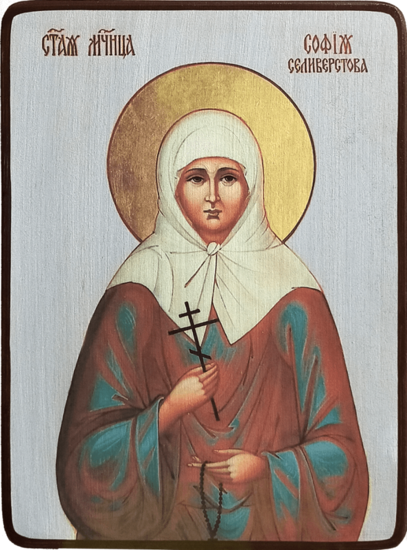 Преподобномученица София (Селиверстова София Панфиловна) родилась 17 сентября 1871 года в селе Изноира Сердобского уезда Саратовской губернии. Когда ей исполнилось 10 лет, умерла мать, и отец девочки отдал её в приют в селе Краюшкино. В приюте она прожила до 20 лет, а затем уехала в Санкт-Петербург, поступила в прислуги и одновременно обучалась на дому рисованию. В 1898 году София Панфиловна поступила в Страстном монастыре в Москве. После закрытия монастыря в 1926 году она поселилась с тремя монахинями в подвальном помещении в доме на Тихвинской улице. 22 февраля 1938 года Софию Панфиловну арестовали по обвинению в "контрреволюционной агитации", а 25 февраля приговорили к расстрелу. 28 февраля 1938 года приговор был приведён в исполнение. Причислена к лику святых Новомучеников Российских постановлением Священного Синода 22 февраля 2001 года для общецерковного почитания.