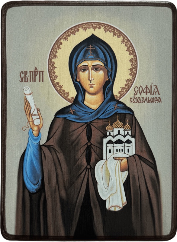 Преподобная София Суздальская (в миру Соломония) была дочерью боярина Юрия Константиновича Сабурова. В 1505 году на нее пал выбор наследника престола, будущего великого князя Василия Иоанновича. Брак их не был счастливым, так как Соломония оказалась бесплодной. Чтобы иметь наследника, великий князь Василий Иоаннович решил жениться вторично (на Елене Глинской) и 25 ноября 1525 г. велел постричь Соломонию в монахини. Насильно постриженная с именем София, Соломония была сослана под стражу в Суздальский Покровский монастырь, где подвигами изгнала из сердца мирские помыслы и всецело посвятила себя Богу.