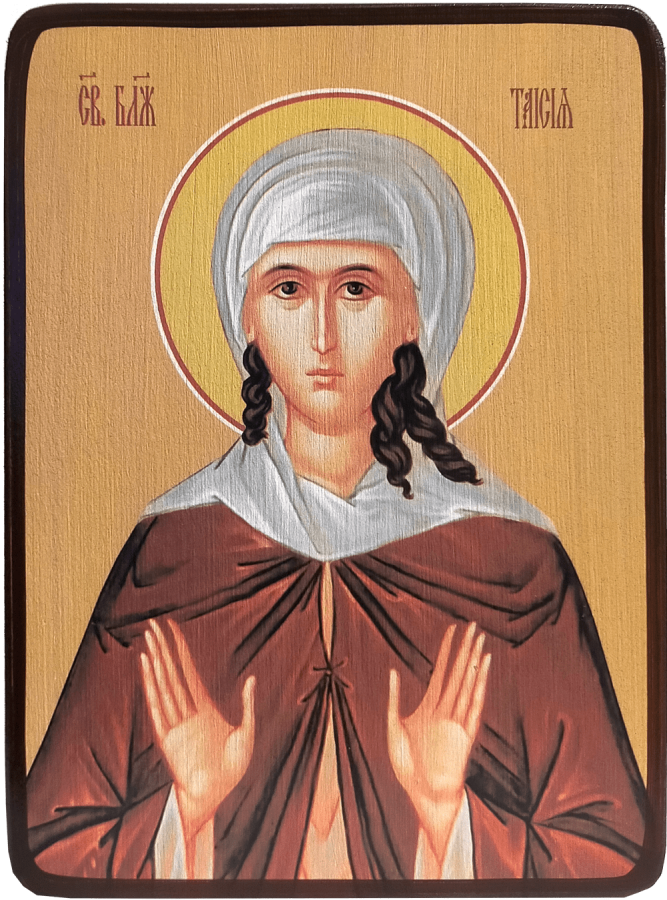 Святая Таисия Египетская жила в V веке в Египте. Родители Таисии были очень богаты. После их смерти, она сначала вела благочестивую жизнь, занималась благотворительностью и помощью больным. Спустя некоторое время её состояние истощилось, и она познакомилась с некоторыми неблагонамеренными людьми и подпала под дурное влияние. Ее жизнь становилась все более и более беспорядочной. В один момент она раскаялась и вместе с аввой Иоанном Коловым отправилась в пустыню. Достигнув ночью пустыни, Таисия и Иоанн улеглись спать. На утро старец начал будить Таисию, но обнаружил, что она уже мертва.