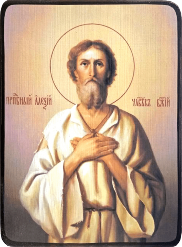 Святой Алексий родился в Риме от знатных и богатых родителей. Однажды ночью он покинул отчий дом, сев на корабль. Так он прибыл в Лаодикию Сирийскую и добрался до города Эдессы, где хранился Нерукотворный образ Господа, запечатленный на плащанице. Алексий оделся в лохмотья и стал просить милостыню возле храма Пресвятой Богородицы. Каждое воскресенье приобщался он Святых Христовых Тайн. По ночам Алексий бодрствовал и молился. Вкушал он только хлеб и воду. После долгих лет странничества он вернулся в родительский дом выдав себя за нищего. Неузнанный, жил до самой кончины в неустанных молитвах, терпеливо перенося скорби. Святому Алексию молятся об избавлении гордыни (он имел глубокое смирение), от привязанности к благам мира, от сребролюбия, а также о родителях, чрезмерно скорбящих об избрании чадом иноческого пути.
