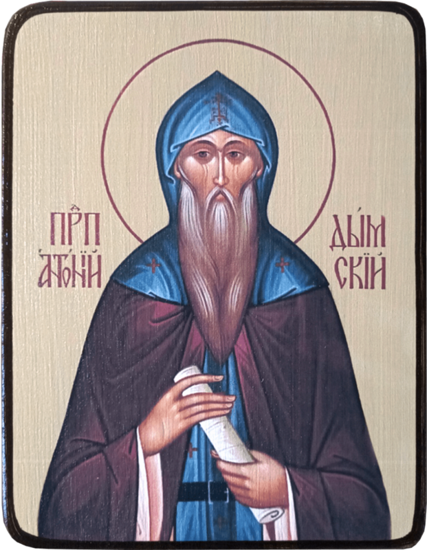 Преподобный Антоний Дымский родился в Hовгоpоде около 1157 года. В Хутынском монастыре он принял пострижение и в той же обители в 1192 году стал игуменом. Спустя некоторое время он тайно удалился из монастыря и поселился на берегу Дымного (Дымского) озера. Святой постоянно носил на голове железную шляпу для большего изнурения своей плоти. Постепенно вокруг него начали собираться братия. С благословения архиепископа Hовгоpодского Исайи и они поставили церковь во имя Антония Великого с приделом Покрова Богоматери. Преподобный Антоний прожил в монастыре до конца жизни и преставился 24 июня 1224 года. Погребён он был в созданной им церкви.