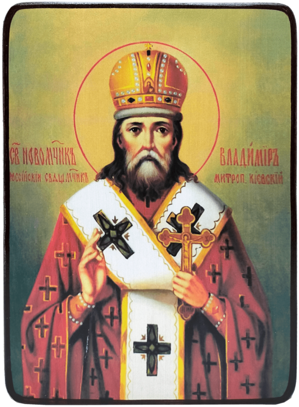 В миру святителя звали Василием, и он был сыном священника, который позже принял мученическую смерть. Мальчик рано познал сиротство.Свой жизненный путь он видел исключительно в священстве. Окончив духовное училище и семинарию, юноша продолжил свое образование в Киевской Духовной Академии. Казалось, все в жизни складывается хорошо, но молодого священника ждало тяжкое испытание. Трагически погибли его жена и ребенок.Василий увидел в этом горе Божий Промысел и принял иноческий постриг с именем Владимир. Он неустанно просвещал людей, построил и восстановил множество храмов, с любовью относился к своим прихожанам. Святитель был духовным отцом великой княгини Елизаветы Федоровны и помог ей основать знаменитую Марфо-Мариинскую обитель.Наступило смутное и страшное время, в Киеве разгорелась гражданская война. Грабежи, насилия, убийства мирных людей стали частыми событиями. В холодный январский день 1918 года окончил свой жизненный путь святитель Владимир. Несколько вооруженных людей вывели его за стены Лавры и после издевательств зверски убили. Перед гибелью святитель успел помолиться и благословил своих мучителей.Сейчас его честные мощи нашли покой в дальних пещерах Лавры, которую святитель очень любил.