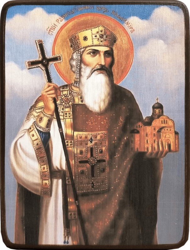 Великий князь Владимир, внук святой равноапостольной княгини Ольги, родился около 960 года и уже в 978 году стал властителем Киевского государства. Святой Владимир принял крещение (с наречением имени Василий), а в 988 году, совершил Крещение Руси. В водах реки Днепр начали креститься все жители Киева, а затем проповедь христианской веры начала свое шествие по Русской земли. Во всех градах разрушались капища языческих идолов, воздвигались православные храмы, начались богослужения. Святой равноапостольный великий князь Владимир преставился ко Господу в 1015 году. С 2002 года святой равноапостольный великий князь Владимир считается небесным покровителем внутренних войск МВД России.