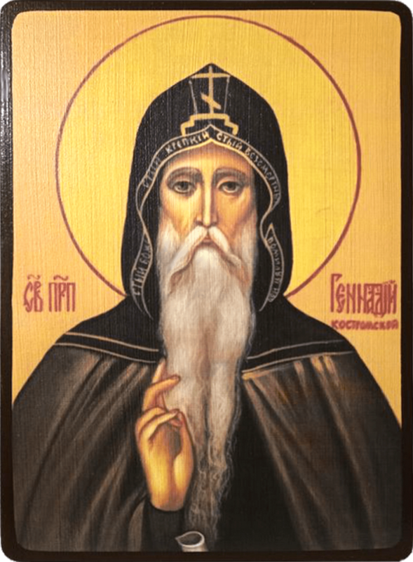 Святой Геннадий родился в Могилеве в состоятельной семье. С юности он любил посещать храм Божий и строго соблюдал посты. Желая посвятить всю жизнь Богу, он тайно оставил родителей и отправился в Россию. Посетив Москву и Новгород, он не нашел монастыря по своему духу и тогда отправился на реку Свирь к преподобному Александру. Святой Александр Свирский направил его к преподобному Корнилию Комельскому, который и постриг его в иноческий чин с именем Геннадий. Спустя время Корнилий и Геннадий удалились на Сурское озеро, где основали пустынь с двумя храмами (Геннадиев монастырь). Преподобный Геннадий непрерывно трудился, пек просфоры и хлеб, рубил дрова, копал с братией пруды. Ради большего подвига он постоянно носил вериги. Он очень любил писать иконы и ими украшал храмы своей пустыни. За свою благочестивую жизнь святой Геннадий получил от Бога дар прозорливости и исцелений.