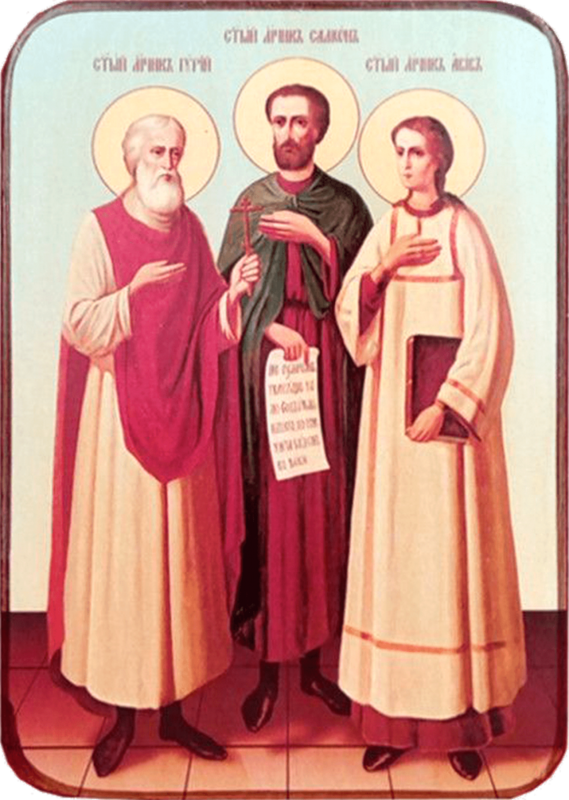 Икона Гурий, Самон и Авив на голубом фоне