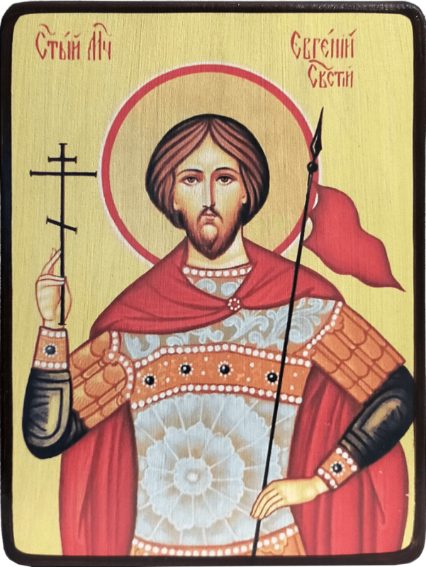 Имя Евгений в переводе с греческого языка означает - благородный, знатный. Евгений Севастийский жил в эпоху императора Диоклетиана в городе Севастии, располагавшемся на территории современной Армении. В период правления Диоклетиана был всплеск язычества, иконоборчества и гонения на христиан. Святой мученик Евгений пострадал за открытое вероисповедание христианства вместе со святыми мучениками Евстратием, Авксентием, Мардарием и Орестом в это трудное время.