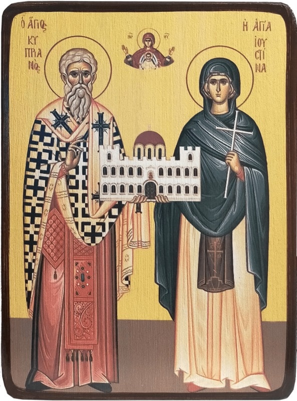 Святые мученики Киприан и Иустина пострадали за Христа в IV веке. На иконе святой Киприан изображен в епископском облачении с Евангелием в руках. Иустина в правой руке держит крест - символ мученического подвига. Её левая ладонь обращена в сторону молящихся, как знак простоты и открытости угодницы Божьей. Священномученик Киприан был до Крещения языческим волхвом, творившим чудеса силой бесовской. Однажды к магу обратился богатый и знатный юноша с целью соблазнить христианку Иустину, отказавшуюся стать его женой. В ответ на преступную просьбу Киприан послал к девице нечистого духа, но демон был посрамлен молитвой Иустины, а сам волхв, познав силу Христовой веры, принял Святое Крещение. После обращения Киприан проводил высокую добродетельную жизнь, непрестанно оплакивая прежние согрешения, за что был удостоен епископского сана. Святые Киприан и Иустина, осужденные по ложному доносу, приняли смерть за Христа при императоре Диоклетиане.