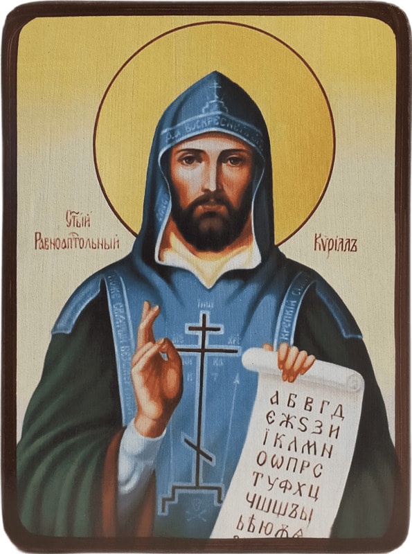Святой Кирилл (в миру Константин) Философ, Моравский, и его брат Мефодий (в миру Михаил) являются проповедниками христианства, просветителями славян, создателями славянской азбуки и церковнославянского языка. В славянском православии они почитаются как святые равноапостольные "учители словенские".