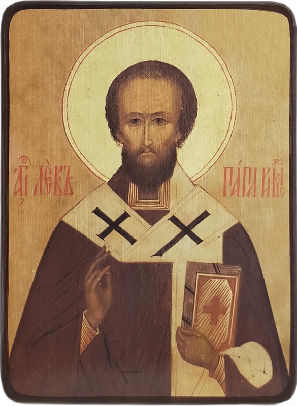 Святитель Лев, папа Римский (440-461 гг.) известен был своим благочестием и ученостью. Как истинный пастырь, он неустанно защищал Православное учение. Он принял личное участие в осуждении ереси Евтихия на Четвертом Вселенском соборе в городе Халкидоне. В 452 году святой Лев силой своего слова удержал Аттилу, предводителя гуннов, от разорения Рима, а в 455 году убедил Гензериха, короля вандалов, не проливать кровь и не предавать Рим огню. За свою успешную защиту и благочестие Православия его назвали "великим". Скончался он в 461 году, оставив после себя послание к Флавиану, патриарху Цареградскому, о двух природах (естествах) Иисуса Христа - Божеской и человеческой. Кроме того дошло до нас около 100 простых, но сильных его проповедей и около 140 писем к разным лицам, богатых психологическими наблюдениями. Мощи святителя Льва почивают в приделе его имени в Ватиканском соборе в Риме.