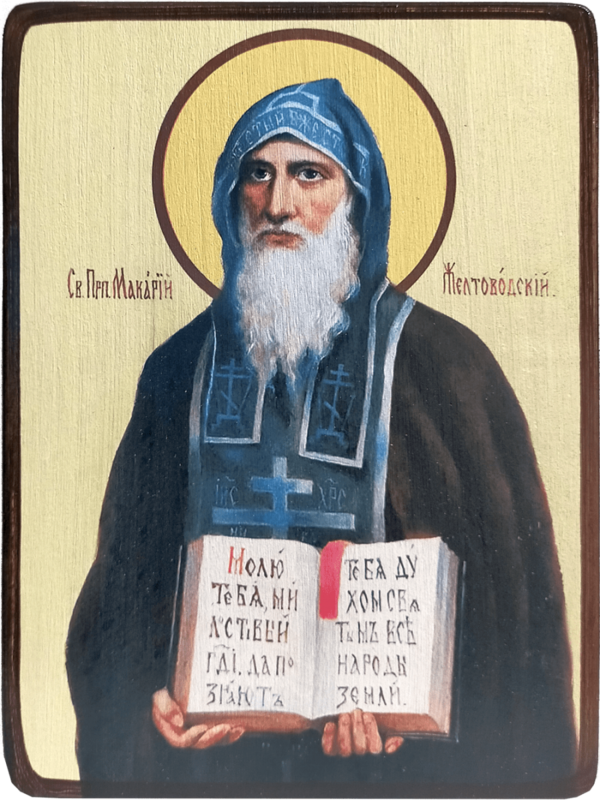 Преподобный Макарий Желтоводский, Унженский, родился в 1349 году в Нижнем-Новгороде. В 12-летнем возрасте он тайно ушел от родителей и принял иноческий постриг в Нижегородской Печерской обители. Преподобный Макарий удалился на берег реки Волга и подвизался здесь в пещере близ озера Желтые воды. Туда к нему собрались любители безмолвия, и в 1435 году он устроил для них обитель во Имя Пресвятой Троицы. Здесь он начал проповедовать христианство окрестным черемисам и чувашам, и крестил магометан и язычников в озере, получившем название святого.