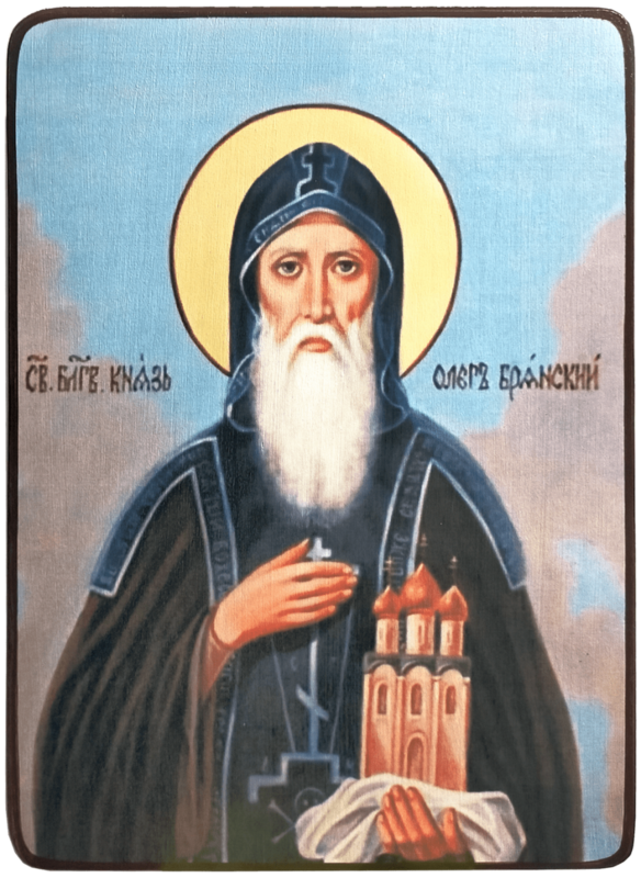 Святой Олег Романович (в крещении Леонтий), князь Брянский, был внуком князя Михаила Черниговского, замученного в Орде татарами. Святой Олег был равнодушен к богатству и мирской славе. Его больше всего привлекала монашеская жизнь. Поэтому, уступив свой престол брату он постригся в монахи. При постриге его нарекли Василием. Святой Олег стал известен строгостью своей монашеской жизни. Он мирно скончался в своем монастыре около 1289 г. Его мощи почивали в Петропавловском Брянском монастыре, им построенном.