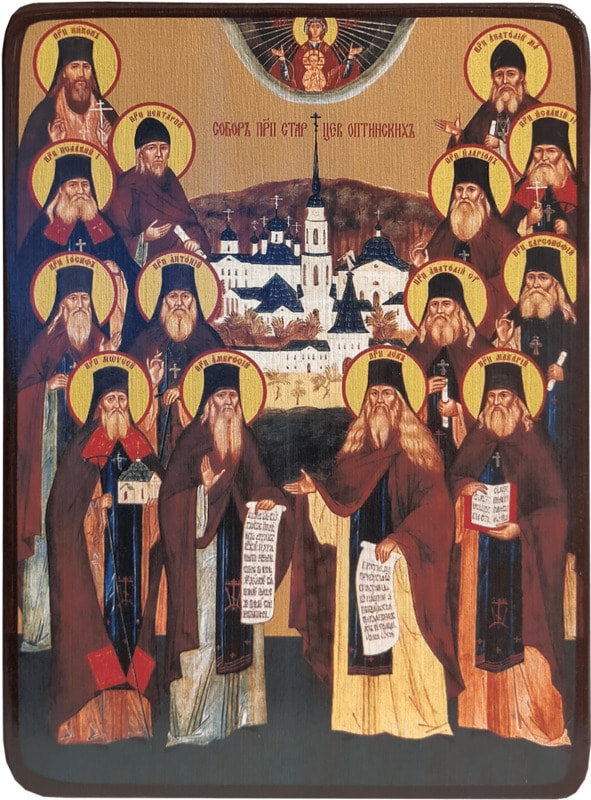 С XVIII по XX века в Оптинском монастыре служило Богу много прославленных ныне старцев. На иконе мы видим четырнадцать святых. О каждом из них можно рассказать отдельную историю, полную духовных подвигов, братской любви, смирения и послушания.