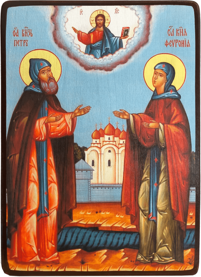 Святой благоверный князь Пётр был вторым сыном Муромского князя Юрия Владимировича. В 1203 году он вступил на Муромский престол. За несколько лет до этого он заболел проказой. Во сне он увидел, что излечить его сможет только дочь пчеловода дева Феврония. Когда князь Пётр увидел святую Февронию, то так полюбил её за благочестие, мудрость и доброту, что дал обет жениться на ней после исцеления. После их свадьбы бояре потребовали от князя, чтобы он выгнал простолюдинку. Получив отказ, они изгнали Петра и Февронию из города. Но вскоре народ взбунтовался и потребовал вернуть их на престол.