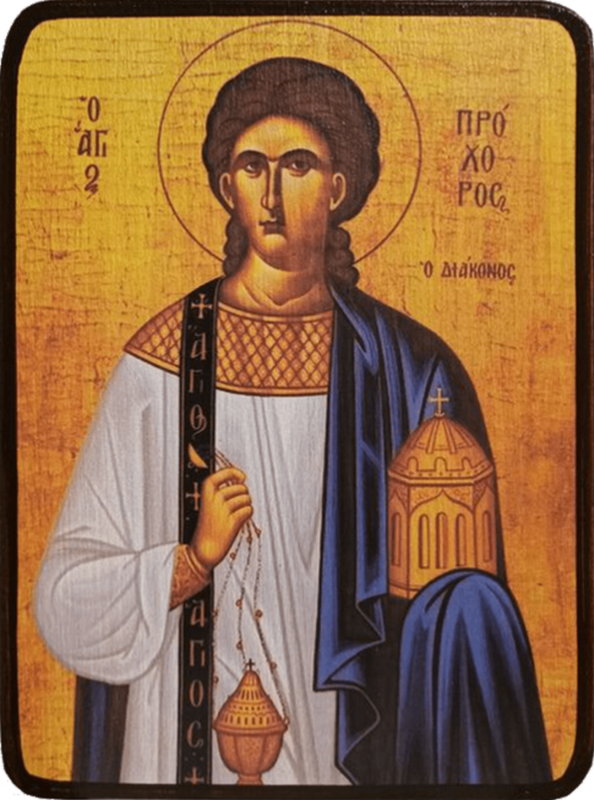 Священномученик Прохор был в числе семи первых диаконов Церкви Христовой, избранных двенадцатью апостолами. Вначале он сопровождал первоверховного апостола Петра, и им был поставлен епископом в город Никомидия. Спустя некоторое время Прохор стал спутником и сотрудником святого апостола Иоанна Богослова. Чуть позже их сослали на остров Патмос. Там он записал Откровение Божие, давшее святому апостолу Иоанну, о конечной судьбе мира - Апокалипсис. После возвращения в Никомидию святой Прохор обращал язычников ко Христу в городе Антиохии и там принял мученическую кончину.