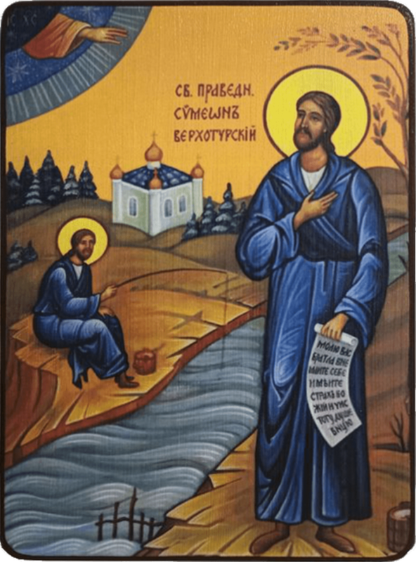 Святой Симеон Верхотурский (Меркушинский) родился около 1607 года в европейской части России в семье дворян. Оставив родителей свой дом, он пришёл в Сибирь, где вёл жизнь странника, скрывая своё происхождение. Большую часть жизни Симеон провёл в селе Меркушино (около 53 километров от Верхотурья) и его окрестностях. В селе он посещал местную деревянную церковь святого Архангела Михаила. В десяти верстах от Меркушино на берегу реки Тура святой Симеон летом уединялся для молитвы, добывая себе пропитание рыбной ловлей. Зимой он занимался пошивом шуб для крестьян в сёлах Верхотурского уезда. Отличался нестяжанием и чтобы не получать платы он оставлял одежду недошитой и уходил из села.