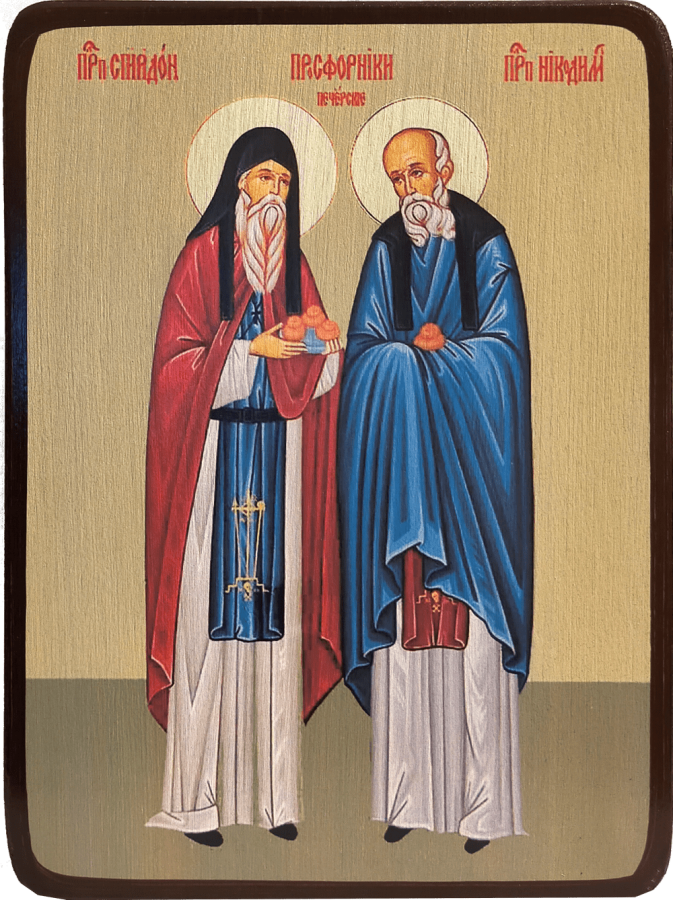 Преподобные Спиридон и Никодим, просфорники Печерcкие, 30 лет исполняли свое послушание - пекли просфоры. Уже немолодым человеком преподобный Спиридон пришел в монастырь при игумене Пимене (1132-1141). Подвижник сопровождал свой труд непрестанной молитвой и пением псалмов. Еще при жизни преподобный Спиридон прославился чудесами. Однажды он потушил мантией загоревшуюся пекарню: огонь погас, а мантия осталась целой. Святой Никодим вел такую же строгую жизнь и трудился вместе с преподобным Спиридоном. Мощи их находятся в Антониевой пещере.