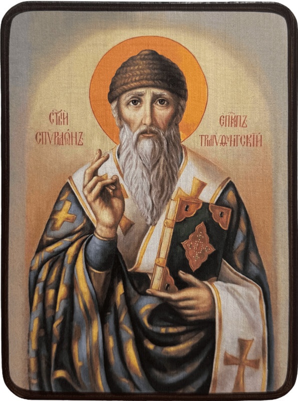 Святитель Спиридон родился в конце III века в деревне Аския на острове Кипр, был пастухом овец. После смерти жены он за чистую и богоугодную жизнь был избран епископом кипрского города Тримифунт. Будучи в этом сане он прославился как чудотворец и целитель. До самого своего конца он выходил в поле с крестьянами. Он сеял и собирал урожай. Однажды была сильная жара, вдруг крестьяне увидели как голова Святителя оросилась прохладной влагой, которая лилась с неба. Затем волосы Святого начали менять свой цвет. Все были поражены чудесными перевоплощениями. На что Спиридон сказал, что скоро он встретится со Спасителем. Это был заключительный год земной жизни Чудотворца. Приставился он во время усердной, искренней и горячей молитвы к Господу. Святитель завещал людям из паствы жить благочестиво, взращивать в себе человеколюбие, милосердие и крепкую веру во Христа. Скончался епископ Спиридон около 348 года и был погребён в храме в городе Тримифунт.