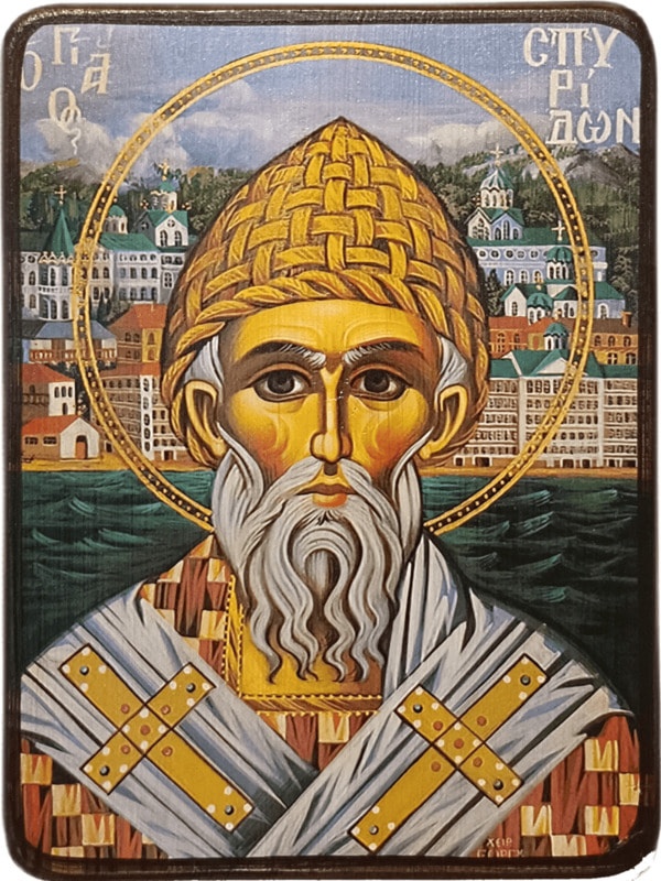Святитель Спиридон родился в конце III века в деревне Аския на острове Кипр, был пастухом овец. После смерти жены он за чистую и богоугодную жизнь был избран епископом кипрского города Тримифунт. Будучи в этом сане он прославился как чудотворец и целитель. До самого своего конца он выходил в поле с крестьянами. Он сеял и собирал урожай. Однажды была сильная жара, вдруг крестьяне увидели как голова Святителя оросилась прохладной влагой, которая лилась с неба. Затем волосы Святого начали менять свой цвет. Все были поражены чудесными перевоплощениями. На что Спиридон сказал, что скоро он встретится со Спасителем. Это был заключительный год земной жизни Чудотворца. Приставился он во время усердной, искренней и горячей молитвы к Господу. Святитель завещал людям из паствы жить благочестиво, взращивать в себе человеколюбие, милосердие и крепкую веру во Христа. Скончался епископ Спиридон около 348 года и был погребён в храме в городе Тримифунт.