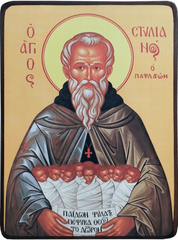 Стилиан Пафлагонянин родился в V веке в Пафлагонии. Достигнув совершеннолетия, он раздал свое имущество бедным, а затем принял монашеский постриг в одном из малоазийских монастырей. Через некоторое время преподобный Стилиан ушёл из монастыря и поселился в пещере в безлюдной пустыне. За богоугодную и святую жизнь Господом ему была дарована благодать покровительства малышам. Матери из близлежащих городов и деревень, издалека приносили ему своих больных детей, и святой исцелял их. Кроме того, по молитвам преподобного Стилиана бесплодные женщины становились многодетными матерями. Скончался он в глубокой старости в V веке. Его почитание распространилось широко за пределы родной области и остаётся сильным особенно в Церквах греческой традиции.