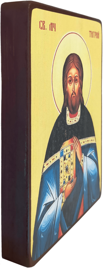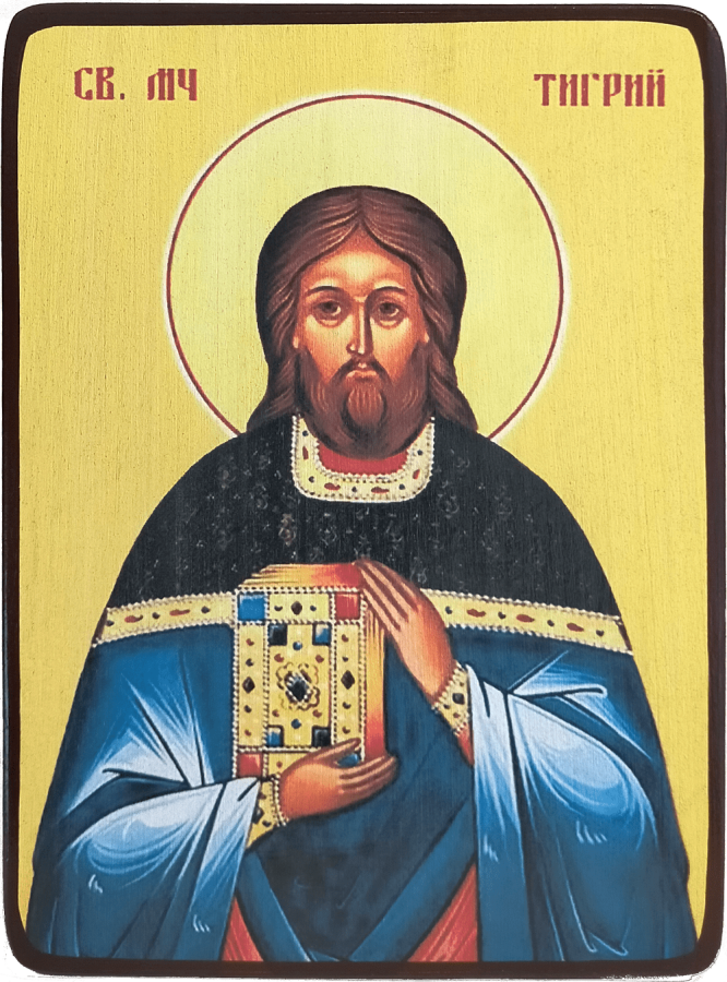 Священномученик Тигрий жил в начале V века и состоял в клире Константинопольского архиепископа, святителя Иоанна Златоуста. В сане пресвитера он прославился как кроткий и милостивый пастырь. Когда в 404 году святитель Иоанн Златоуст был изгнан из Константинополя, святой пресвитер Тигрий, как и его приверженцы были схвачены. Они были обвинены в поджоге храмов и зданий, принадлежавших противникам святого Иоанна Златоуста. Святого Тигрия подвергли истязаниям, били ремнями и сослали в Месопотамию, где он в заключении и скончался.