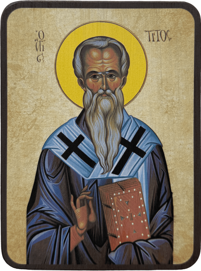 Тит был учеником апостола Павла. Родом с острова Крит. Был язычником, но 20 лет, он во сне получил от Бога повеление прочесть еврейские книги. Прочитав Книгу пророка Исаии, Тит уразумел языческое заблуждение и познал истинного Бога. В это время на остров дошли слухи о Христе - Боге, явившемся во плоти, живущем среди людей в Иерусалиме. Чтобы проверить слухи, святой отправился в Иерусалим. Здесь он увидел Господа и многие Его чудеса. Тит принял святое крещение от апостола Павла, был сопричислен к 70-ти апостолам и вместе со своим учителем проповедовал Христа в разных странах, а потом, при посещении Крита, был поставлен епископом. Совершая епископское служение, апостол Тит неусыпными трудами и чудесами обратил ко Христу многих язычников.