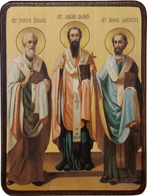 Икона Три Святителя (Вселенские Учителя), на светлом фоне