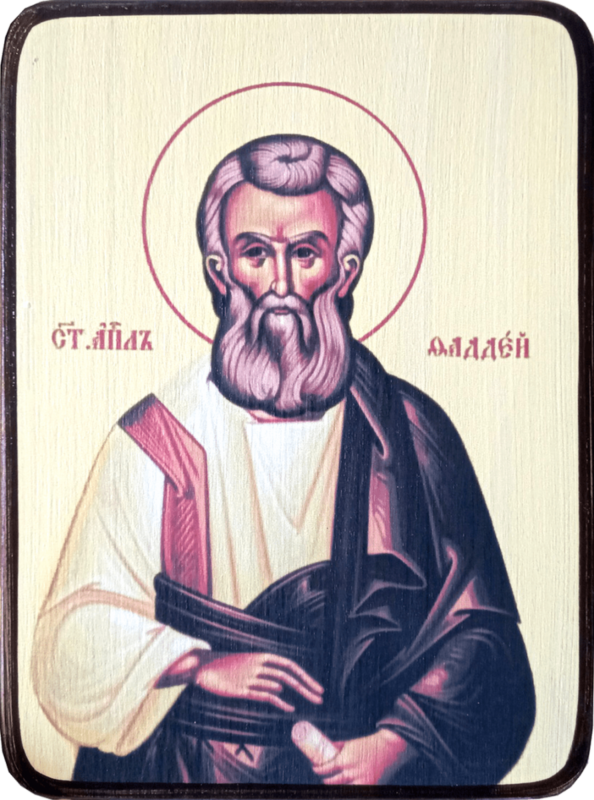 Святой апостол от 70-ти Фаддей был родом из сирийского города Едесса. Однажды он отправился в Иерусалим на праздник, он услышал проповедь святого Иоанна Предтечи и остался в Палестине, приняв от него Крещение в Иордане. Увидев Иисуса Христа, он сделался его учеником, и был избран им в число 70-ти учеников, которых он послал на проповедь в города и местности, которые сам намеревался посетить. После Вознесения Христа апостол Фаддей проповедовал веру Христову в Сирии и Месопотамии. Дойдя до Едессы, апостол обратил ко Христу князя Авгаря, народ и жрецов, поставил священников, устроил Едесскую Церковь, затем снова отправился проповедовать Евангелие.