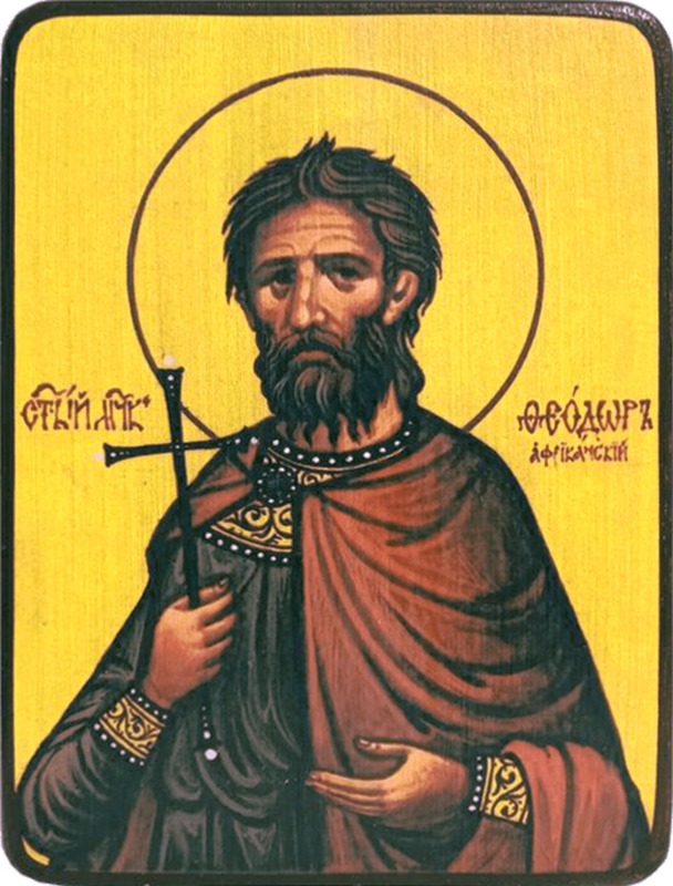Святой Феодор служил в дружине Терентия (при правителе Фортунатиане). События происходили во времена правления римского императора Декия (249-251), который ненавидел христиан. От него в Африку пришел указ, заставить всех жителей принести жертву языческим богам, а тех, кто этого не сделает, предать страшным пыткам. Когда пришла очередь воинам поклониться идолам, Святой Феодор и вся его дружина ответили отказом. Их предводителя и еще нескольких человек заперли в темницу, остальных же стали пытать, добиваясь от них отречения от веры.