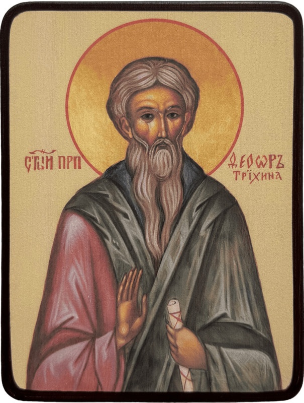 Преподобный Феодор Трихина родился в богатой константинопольской семье. В юности он удалился в пустынную обитель во Фракии и принял монашество. Преподобный был строгим постником, носил только одну грубую, колючую власяницу, отчего и был прозван Трихиною, то есть "Власяничным". Этим именем был назван и монастырь, в котором он подвизался. При жизни преподобный творил много чудес и исцелений. После смерти от его святых мощей истекало целебное миро, которое излечивало многие болезни и изгоняло нечистых духов. Время жизни преподобного Феодора неизвестно.