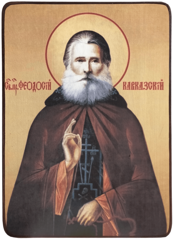 Преподобный Феодосий Кавказский родился 3 мая 1841 г. В юном возрасте он покинул свой дом и отправился на Святую Гору Афон. Стал послушником и принял монашеский постриг с именем Феодосий, был рукоположен во иеродиакона и иеромонаха. Через некоторое время стал служить в Русском странноприимном доме Положения пояса Богоматери в Константинополе(5 лет), а затем направился в Святую Землю, где служил при Храме Гроба Господня. В 1879 г. отец Феодосий вернулся в свою афонскую обитель и в 1901 г. стал её настоятелем. Через несколько лет он отправился в Иерусалим, где принял схиму, и через некоторое время приехал в Россию.