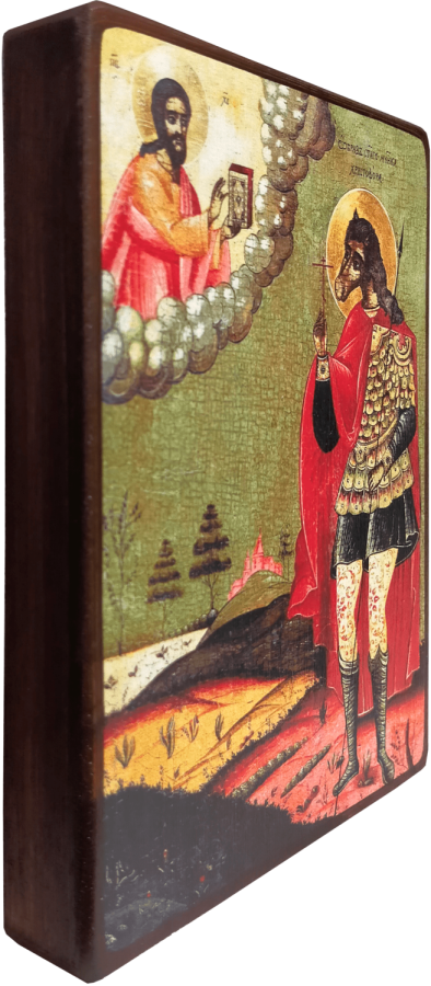 Святой мученик Христофор жил в III веке. Он был человеком высоким и физически сильным, лицо же его было звероподобным. Согласно преданию, в молодости Христофор был внешне привлекателен, но, желая избежать искушений, он выпросил у Господа уродливое лицо. Еще до принятия таинства крещения он исповедовал свою веру во Христа и разоблачал тех, кто преследовал христиан. Узнав об этом, император Декий приказал 200-там воинам арестовать Христофора. На пути к месту казни сухая тростина в руке святого расцвела, а хлеба по его молитве приумножились. Воины были удивлены чудесами. Уверовав во Христа, они приняли в Антиохии крещение. После отказа принести жертву идолам и долгих истязаний мученика зарубили мечом.