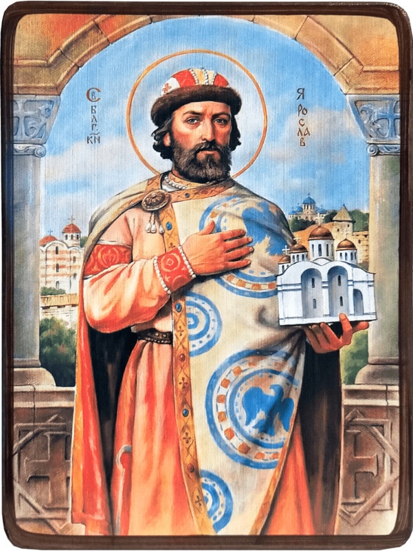 Святой князь Ярослав Мудрый родился около 978 года и был сыном князя Владимира Святославича (крестителя Руси) и полоцкой княжны Рогнеды Рогволодовны. С 987 по 1010 года он был Ростовским князем, с 1010 по 1034 год - Новгородским князем, с 1016 по 1018, а затем с 1019 по 1054 год - великим князем Киевским. Своей законодательной деятельностью, заботами о распространении христианства, о церковном благолепии и просвещении Ярослав так возвысился в глазах древнерусских людей, что получил прозвание Мудрого. Немалую роль в его деятельности играли и заботы о внутреннем благоустройстве земли, ее спокойствия и безопасности. Скончался Ярослав Мудрый 19 или 20 февраля 1054 года в Вышгороде. 8 декабря 2005 года его имя было внесено в месяцеслов по благословению Святейшего Патриарха Алексия II.