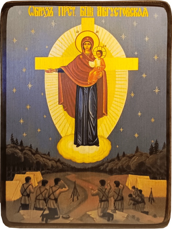 В 1914 году, в разгар Первой Мировой войны, шли кровопролитные сражения за Восточную Пруссию. Недалеко от польского города Августов русские казаки оказались в окружении. Ночью им было чудесное явление Богородицы, которая указала направление. Последовав совету Божией Матери, солдаты не только избежали плена, но и одержали победу в этом бою. Спустя два года после этого события оно было отражено в иконе.