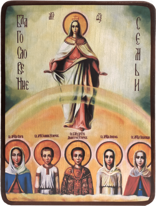 На святом образе мы видим, как Божия Матерь покровительственно простирает руки над отроками-мучениками царевичем Дмитрием и Иоанном Чеполосовым, а также святыми Верой, Надеждой, Любовью.