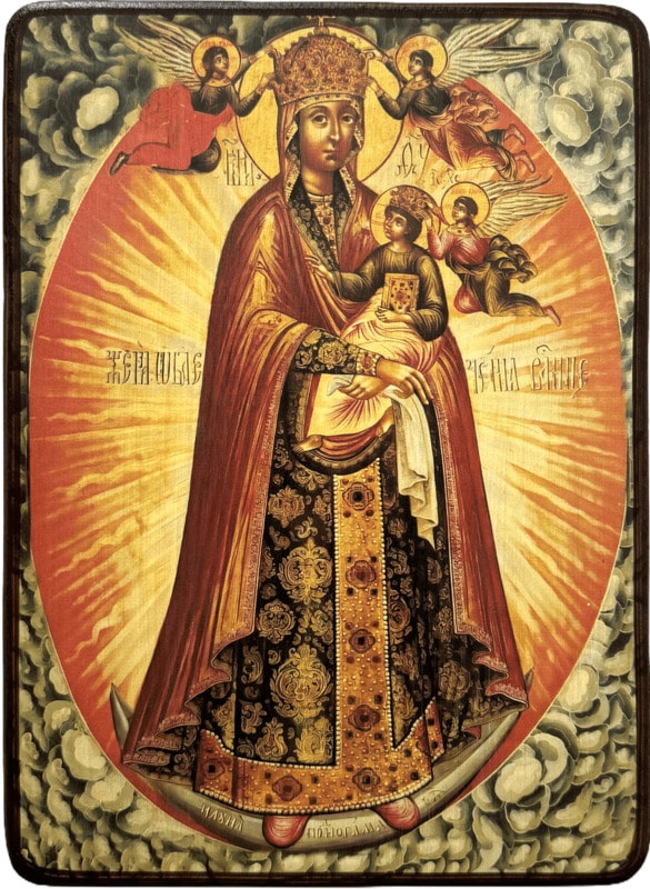 Аллегорический тип Богоматери в облике Апокалиптической жены возник в Германии в XV веке. В этой иконографии Богородица представлена в рост, с Младенцем на руках. Её ноги опираются на лунный серп, от фигуры исходят золотые лучи, образующие ореол сияния (мандорлу), на голове Богородицы (в большинстве изображений и на голове Младенца) корона. Образ является прямой иллюстрацией слов из Апокалипсиса: «И явилось на небе великое знамение: жена, облеченная в солнце; под ногами ее луна, и на главе ее венец из двенадцати звезд... И родила она младенца мужского пола, которому надлежит пасти все народы жезлом железным» (0тк. 12:1,5).