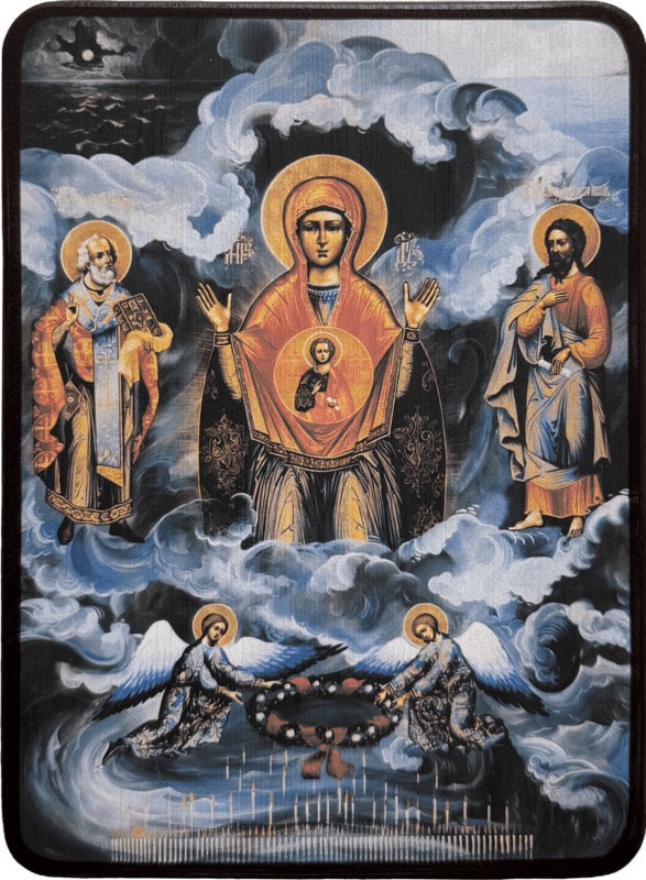 10 августа 2003 года, в канун годовщины печального события, икона была передана в Свято-Никольский храм посёлка Видяево. На образе на фоне морских волн изображено «Знамение Пресвятой Богородицы». Рядом с Божией Матерью стоят покровитель моряков Святитель Николай Чудотворец и святой апостол Андрей Первозванный. Внизу два ангела опускают в воду траурный венок и 118 зажжённых свечей – по количеству погибших подводников.