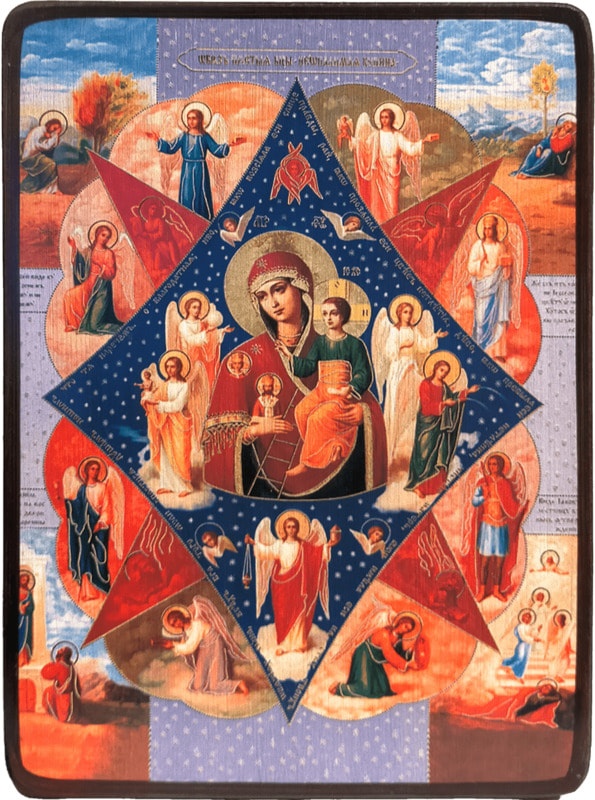 В чем помогает икона Неопалимая Купина Божией Матери на цветном фоне