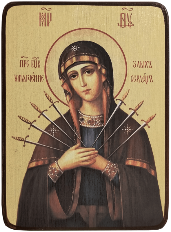 Удивительна иконография святыни. Пречистая Дева изображается одна, без Младенца. Семь острых стрел пронзают ее грудь, а лик выражает скорбь и страдание, которое причиняют Богородице людские грехи.