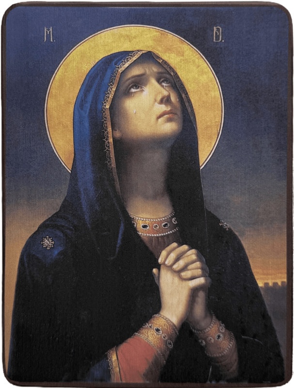 Эта икона молчания, икона смирения очень впечатляет. Ее уникальность состоит в том, что Пресвятая Богородица изображена одна, без Младенца Иисуса на руках. Но что привлекает, так это выражение Ее заплаканного лица после распятия Сына Своего. Художнику удалось создать впечатляющий портрет, хорошо передать внутреннее состояние Пресвятой Богородицы, "собрав" глубинные смыслы Ее чувств — бесконечную боль, жалость, смирение, любовь и надежду.