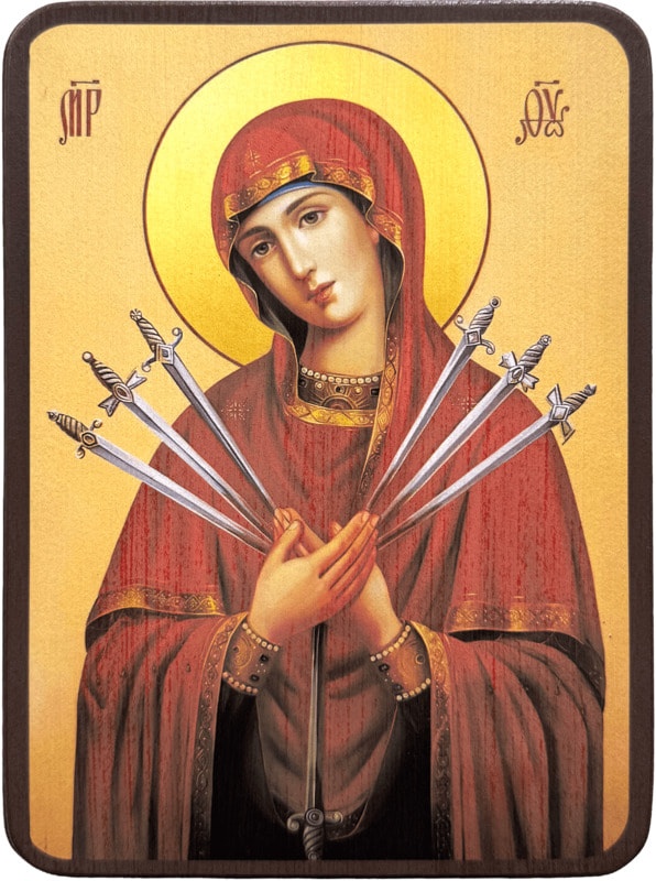 Богородица изображается в момент страдания - в ее сердце вонзаются семь острых мечей. Количество мечей символизирует необыкновенное горе, сердечную боль и сокрушение о судьбах человечества.