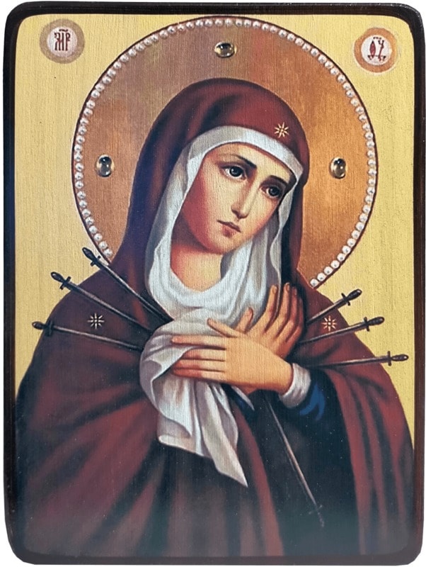 Очень часто эту святыню путают с другой известной иконой - Семистрельная. Но есть небольшие различия в иконографии. Семистрельная отличается расположением стрел, которые вонзены в Пресвятую Деву с двух сторон. На этом образе Богородицу пронзают с каждой стороны по три меча, и еще один расположен внизу.